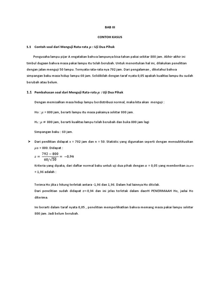 Masa hidup lampu a mempunyai simpang baku (σ) = 60 jam. Menguji kebenaran sebuah hipotesis dengan tingkat keyakinan tertentu? Uji dua arah uji satu arah. Jenis pengujian ini dipakai untuk melakukan pengujian berupa perbandingan proporsi 2 populasi. Berikut ini beberapa contoh hipotesis yang dapat diuji kebenarannya:
