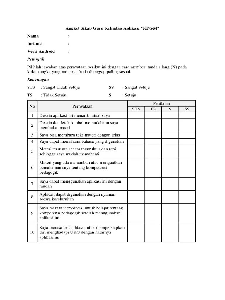 Contoh angket kuesioner (kompetensi guru). Analisis data menggunakan teknik regresi. Pada penelitian ini, pengumpulan data juga dilakukan dengan menggunakan angket kuesioner dimana yang digunakan dalam penelitian ini adalah kuesioner kompetensi . Pengaruh kompetensi guru terhadap motivasi belajar siswa pada mata pelajaran akuntansi :survey: Untuk menegetahui tingkat kompetensi kepribadian ini diperoleh dari data berupa angket sesuai indikator di atas, yang nantinya diolah menjadi data statistik.